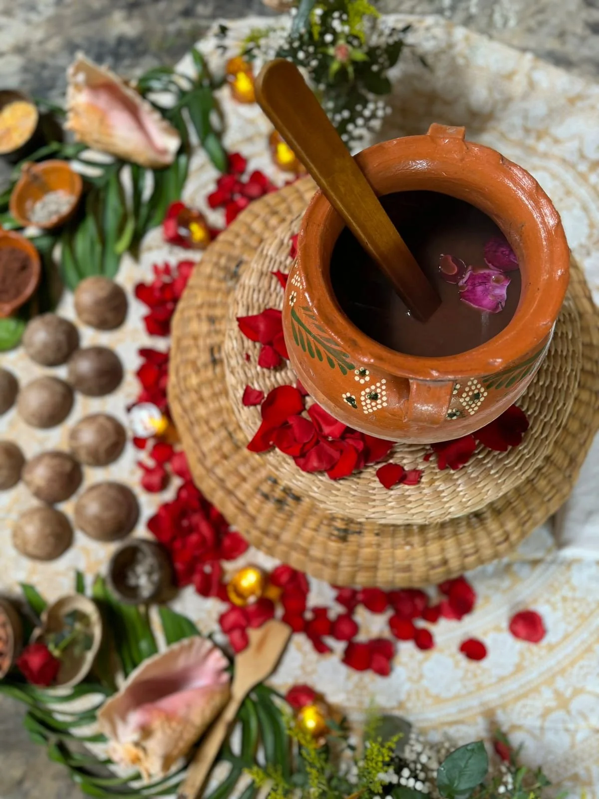 Cacao is an ancestral Mayan medicine used in ceremony to support connection and heartfelt presence. It contains natural compounds that gently increase circulation, which creates warmth, openness, and emotional clarity. Cacao calms the nervous system and helps you return to a steady and grounded state. It guides you back to the quiet truth and pure feeling of your own heart.
